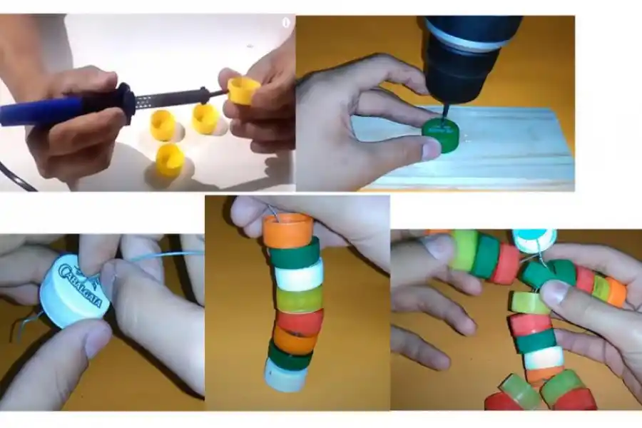 b) En lugar de pegamento, puedes perforar las tapitas, haciendo un agujero en el medio con un elemento caliente o con punta para luego unirlas con un alambre, o un hilo de tanza o hilo piolín.