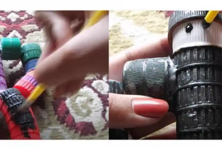 3- Perforar las tapas con un clavo o una tijera de punta (pedir la ayuda a un adulto)