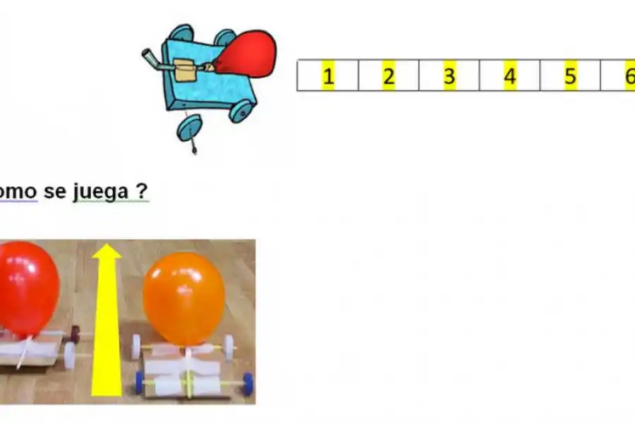 ❖ El primer participante tira el dado y observa el número, infla el globo, calculando el aire que necesitará para hacer llegar su auto al casillero pintado en el piso con el mismo número que obtuvo de la tirada del dado. Suelta el globo y observa donde se detiene.