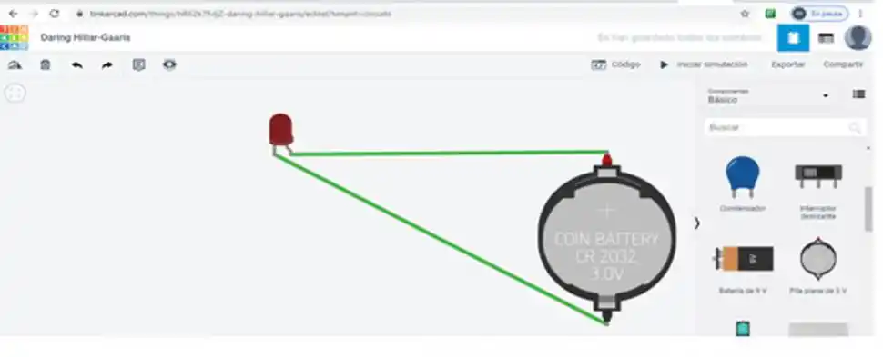 Para eso colocamos el mouse en las patas de la batería y lo arrastramos hacia la pata del led, verás una línea de color verde que representa el cable conductor. Repite el proceso para colorar los 2 cables que necesitas para completar tu circuito.