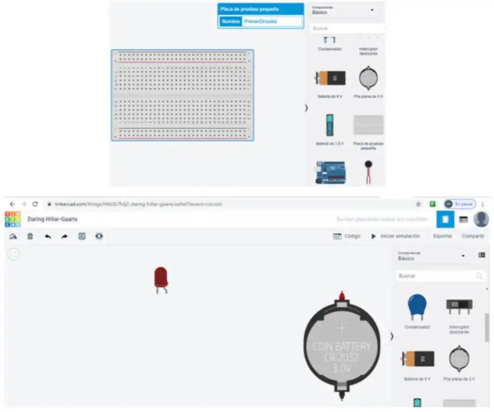 4- De la barra lateral elegimos uno a uno los componentes que necesitamos, arrastrándolos al centro de la pantalla. Recuerda que necesitaremos la pila CR 2032 y un led