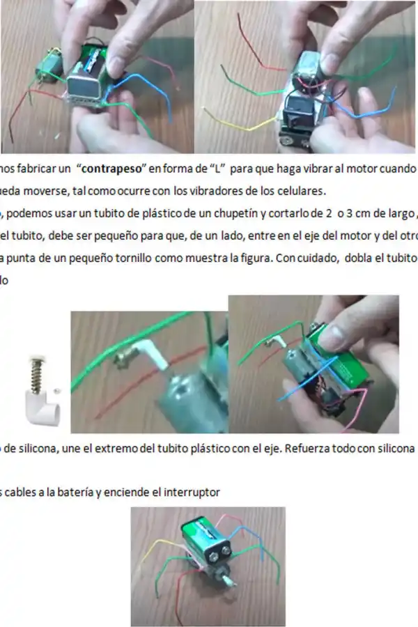 7 - Ahora debemos fabricar un “contrapeso” en forma de “L” para que haga vibrar el motor cuando este gire, así nuestro robot pueda moverse, tal como ocurre con los vibradores de los celulares.