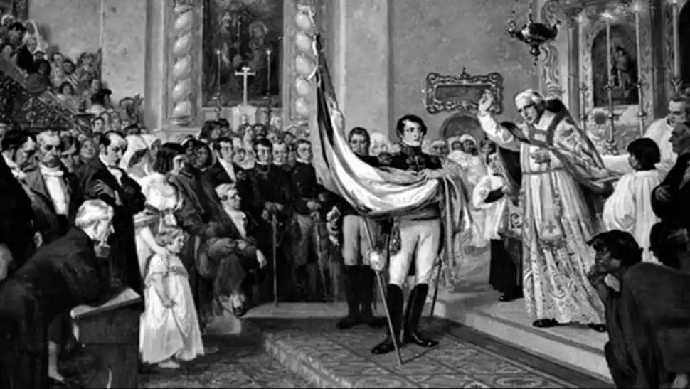 En la ribera del río Paraná, en la actual ciudad de Rosario, Belgrano decide crear una bandera celeste y blanca, los colores tanto del cielo y las nubes como de la escarapela que se venía usando como distintivo desde las invasiones inglesas. Sin embargo, la historia no es tan sencilla. El Triunvirato, que ejercía el gobierno desde Buenos Aires, le pide a Belgrano que anule su creación, precisamente para evitar roces con los países de Europa. Belgrano desconoce esta orden y marcha a su campaña en el Norte. En Jujuy la enarbola por primera vez y la hace bendecir.