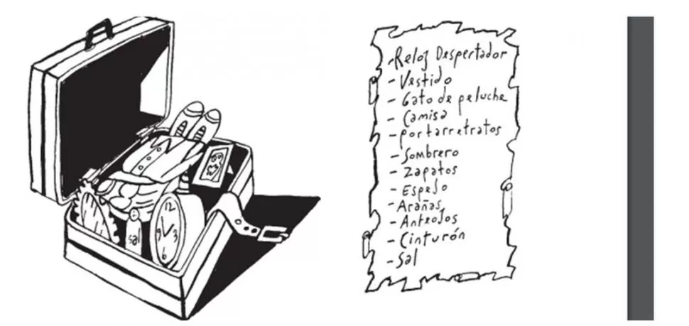 - Lean la lista que escribió y compárenla con todo lo que está dentro de la valija. Con una marquita, señalen lo que ya guardó. ¿Qué cosas le faltan todavía?