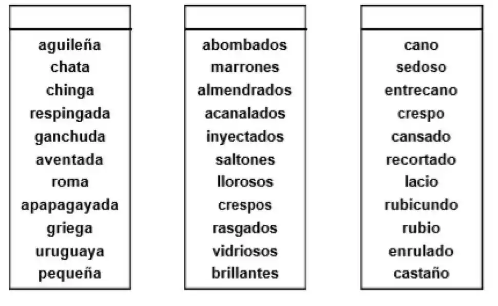 ● Lean las tres columnas de palabras que enumeran adjetivos que califican una parte de la cabeza de las personas: