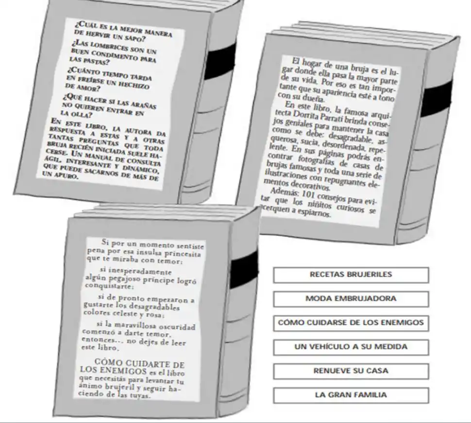 Todas las brujas consultan sus libros de hechizo, brujerías y recetas. Te invitamos a que leas las contratapas de los libros que nuestra bruja lleva también en sus viajes, cuyos títulos están en los recuadros de abajo.
