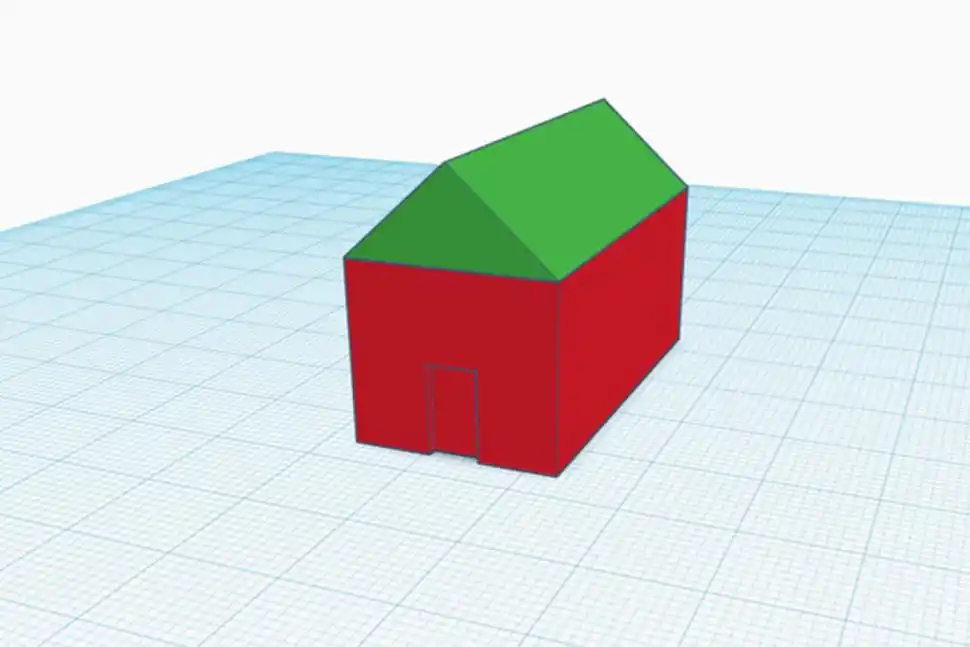 Nos falta la puerta, para ello usaremos el cubo “hueco” transparente lo colocamos en el plano de trabajo y lo modificamos con las siguientes medidas 5mm de ancho, 2mm de largo y 10mm de alto, ubicamos el cubo hueco en el lugar donde va la puerta (podemos mover la figuras con las teclas de direcciones del teclado) y cuando ya estemos conformes con la posición seleccionamos ambos cubos (presionando la tecla shift) y usando la herramienta agrupar combinamos ambas figuras. Listo! ya tienes terminada tu casa, puedes agregar más figuras y decorarla a tu gusto. ¿Te animas a hacer el interior de la casa hueco?