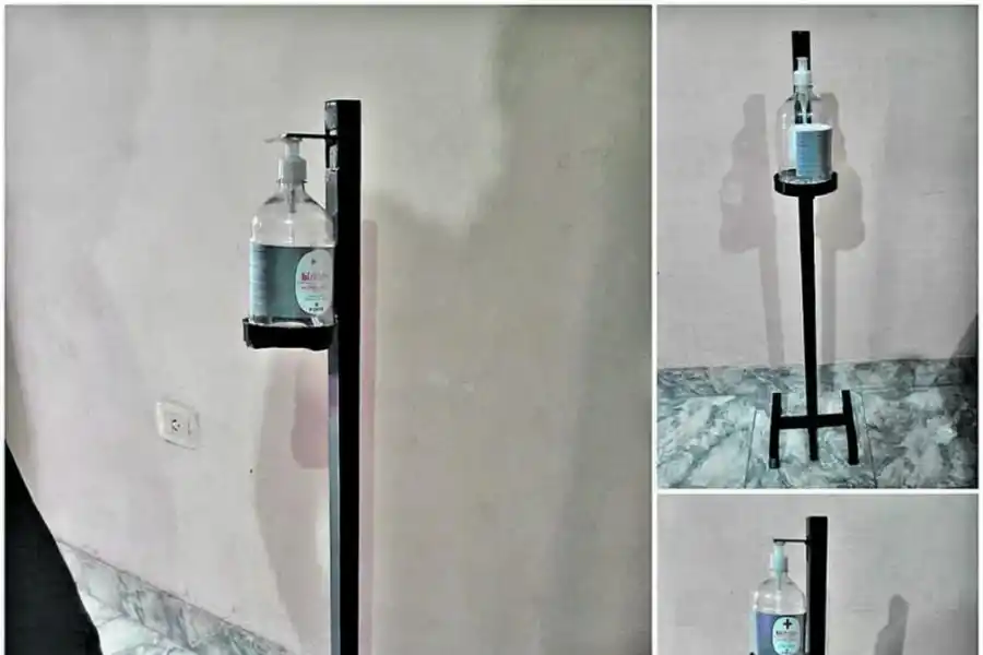Jiménez pensó en crear un dispenser manos libres. Como en su casa tenía un soldador que compró hace tiempo para entretenerse, probó hacer un modelo de prueba y le salió bien. Entonces, lo puso a la venta. El artefacto, diseñado para botes de medio litro, tiene un pedal en donde cada uno aprieta y la medida de alcohol sale directamente a la mano. No posee cables, ni necesita electricidad; es pura mecánica, explica Adrián, que es docente de Educación Física y se especializa en terapias de rehabilitación. Y cuenta que ya tiene muchos pedidos de escuelas que empezaron a adecuarse para la futura vuelta a clases.
