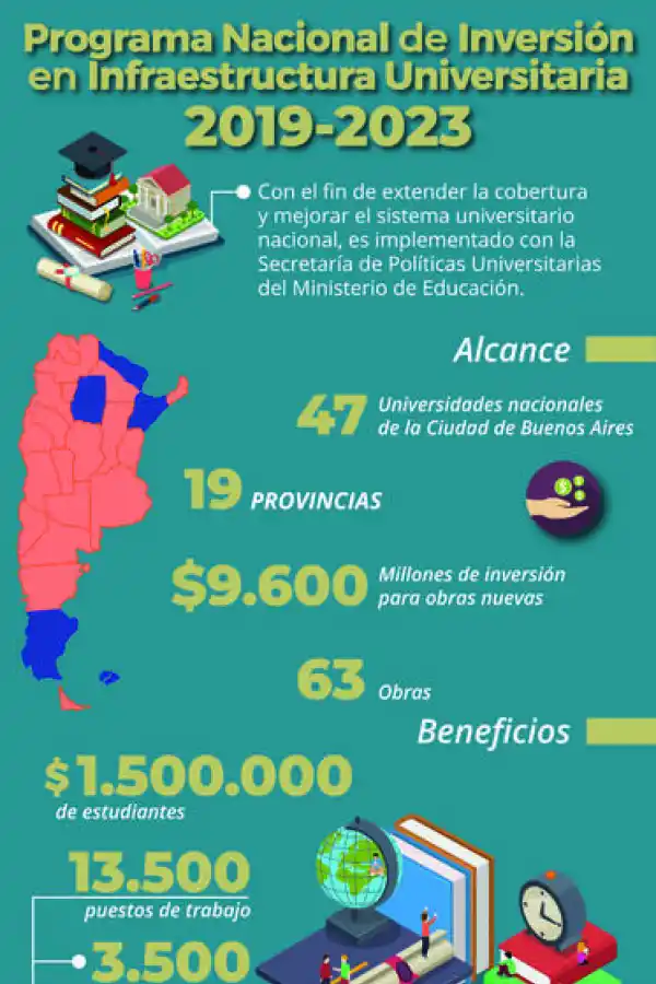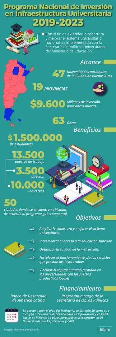 El Programa será implementado en forma conjunta por las carteras de Obras Públicas y Educación de la Nación, con financiamiento del Banco de Desarrollo de América Latina (CAF), con el objetivo de extender la cobertura y mejorar el Sistema Universitario Nacional. Permitirá generar, además, 3.500 empleos directos y otros 10.000 indirectos, según se indicó.