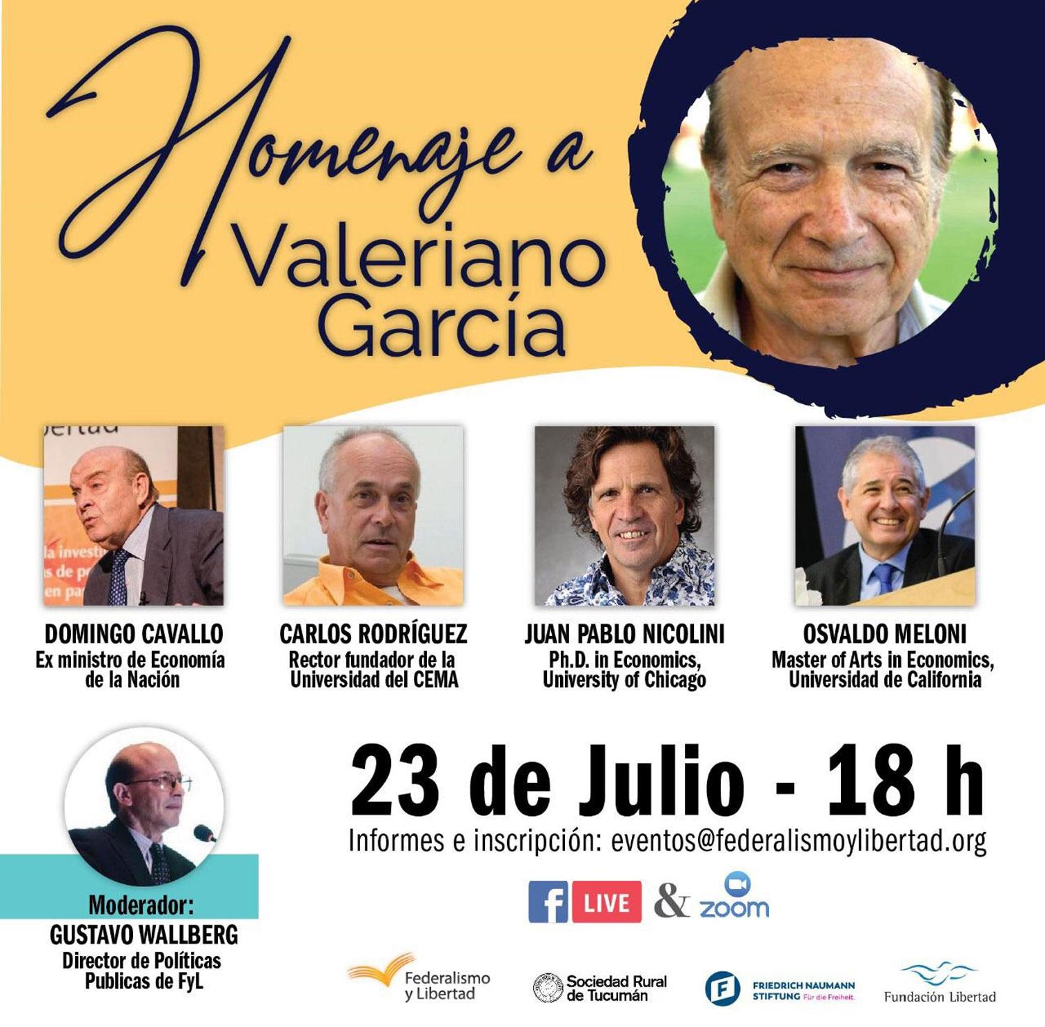 La Fundación Federalismo y Libertad, con el apoyo de la Fundación Friedrich Naumann y la Sociedad Rural de Tucumán, realizará un homenaje a Veleriano García, destacado economista formado en la UNT y en Chicago. Participarán Domingo Cavallo, Carlos Rodríguez, Juan Pablo Nicolini y Osvaldo Meloni. La cita es el jueves 23 de julio, a las 18, por vía Zoom y Facebook Live.