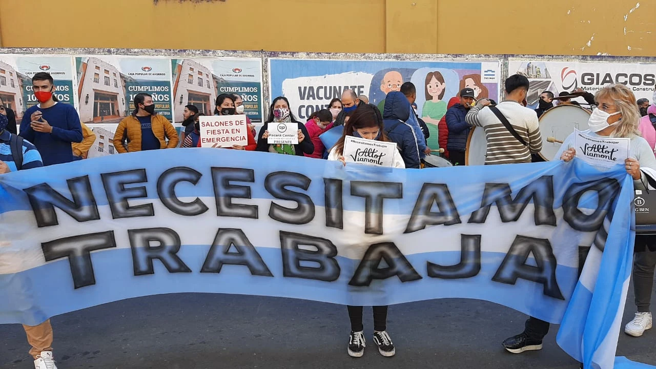 Tras formar una Cámara, propietarios de salones de fiesta se reunieron en la puerta de la Casa de Gobierno para reclamar la vuelta de la actividad. "Necesitamos trabajar", decía la bandera Argentina que los dueños levantaron.