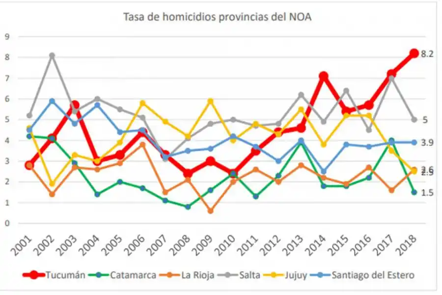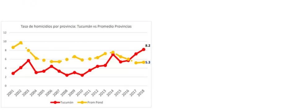 En 2001, de acuerdo al SNIC, Tucumán mostraba una tasa de 2,8 homicidios cada 100.000 personas. Para 2018 este resultado es de 8,2 homicidios cada 100.000 personas. En conclusión, la tasa de homicidios se ha triplicado en el período bajo estudio.
