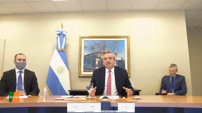 El presidente Alberto Fernández, quien estuvo acompañado por el ministro de Economía, Martín Guzmán, se refirió esta tarde a la deuda del país durante un evento del Council of Americas. "No es posible pedirle más esfuerzo a un país que tiene un 40% de pobreza", señaló el jefe de Estado.