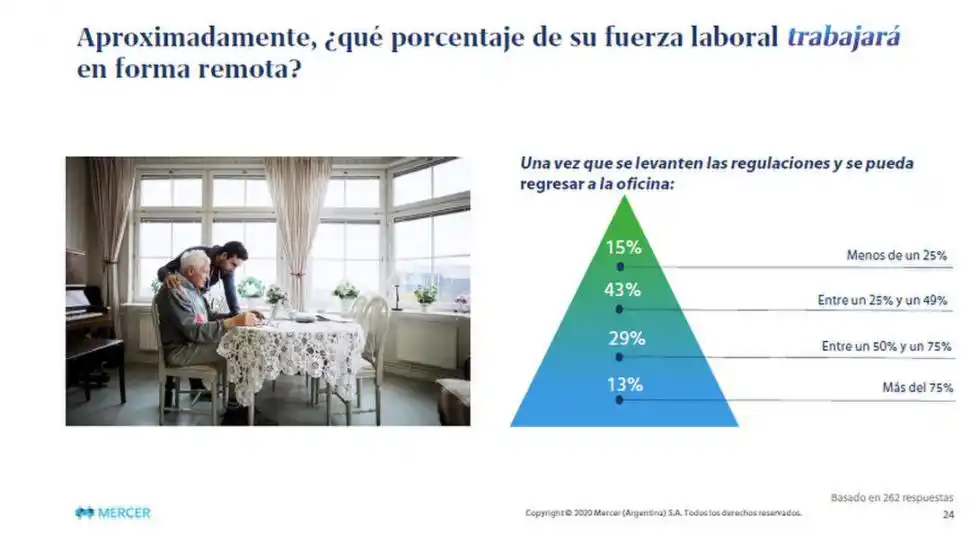 Actualmente durante el aislamiento, el 53% de las empresas tiene a más del 75% de su personal trabajando en forma remota; el 21% tiene entre un 50% y un 75% haciendo teletrabajo, señala Mercer.