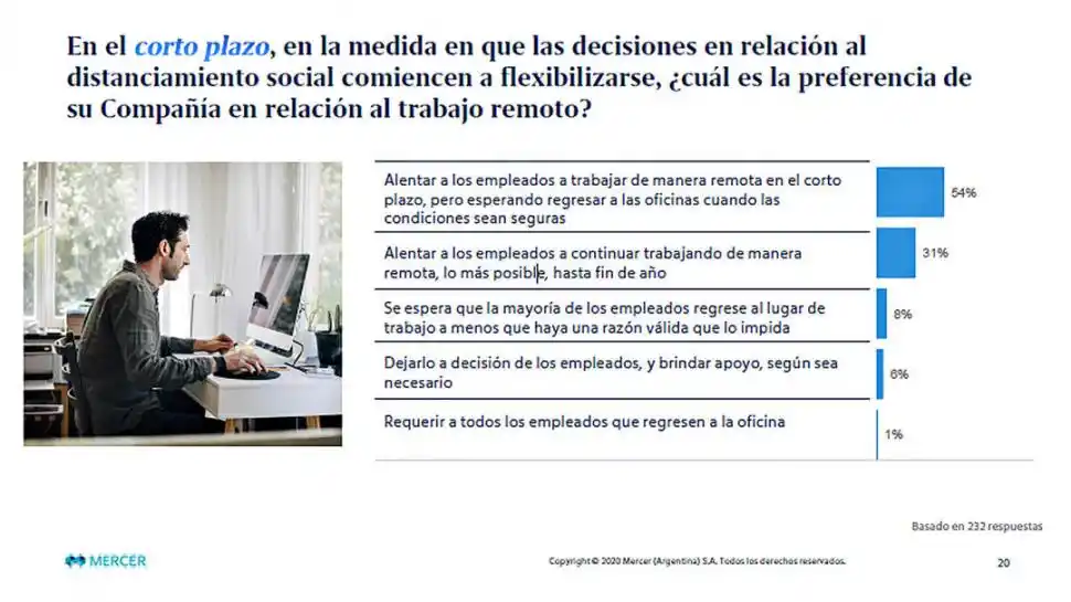 “En general vemos que las compañías convertirán el trabajo remoto en una filosofía de trabajo flexible, dado que quedó demostrado que es posible trabajar de esta manera. Es por eso que vemos que la expectativa es que aumente el porcentaje de personas que trabajen bajo esta modalidad. Dicho esto, también se vio la importancia de compartir el mismo espacio físico en ciertas circunstancias y, en su mayoría, las compañías esperan lograr una combinación entre ambas modalidades de trabajo”, indicó Ivana Thornton, directora de Career de Mercer.
