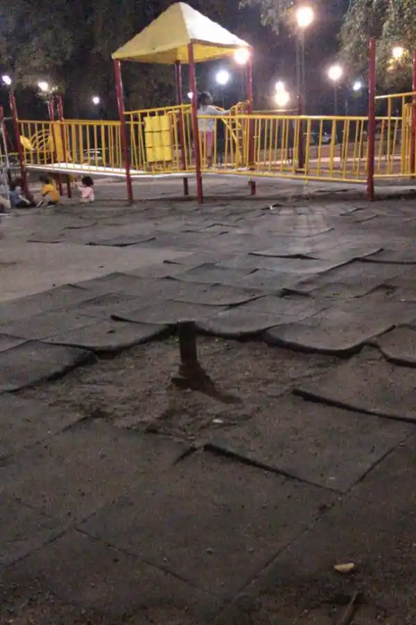 El piso de goma levantado, con una punta de hierro que genera riesgo constante para los niños; asientos de juegos rotos y herrumbrados y arenero plagado de basura. Un lector dijo que el sector juegos de la plaza Urquiza es un desastre.