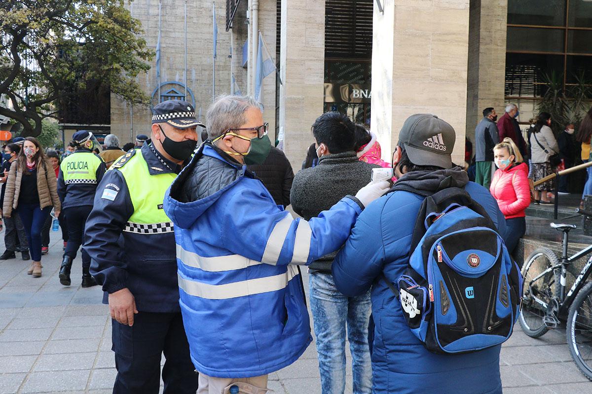 En un trabajo conjunto entre la Dirección de Emergencias Sanitarias 107 del Siprosa y el Ministerio de Seguridad, se llevó a cabo un control de temperatura, uso de barbijo y distanciamiento físico en la zona céntrica de la Capital.