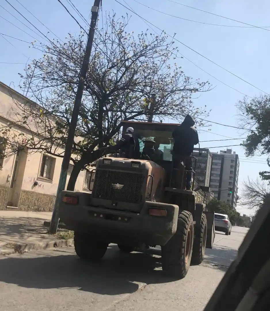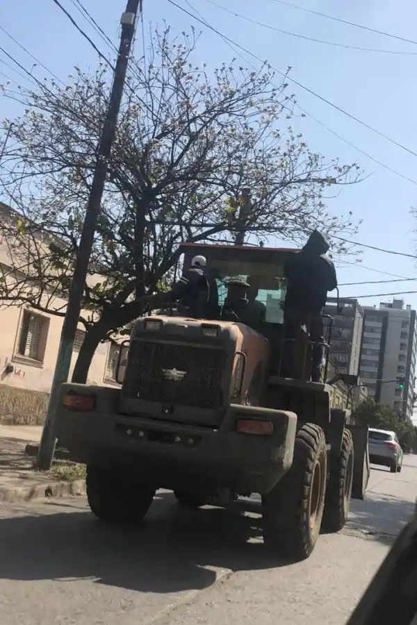 Por Entre Ríos y avenida Roca circulaba la máquina que pertenece a la Municipalidad, según el lector que envió la foto, con los obreros asidos a las barandas del vehículo.