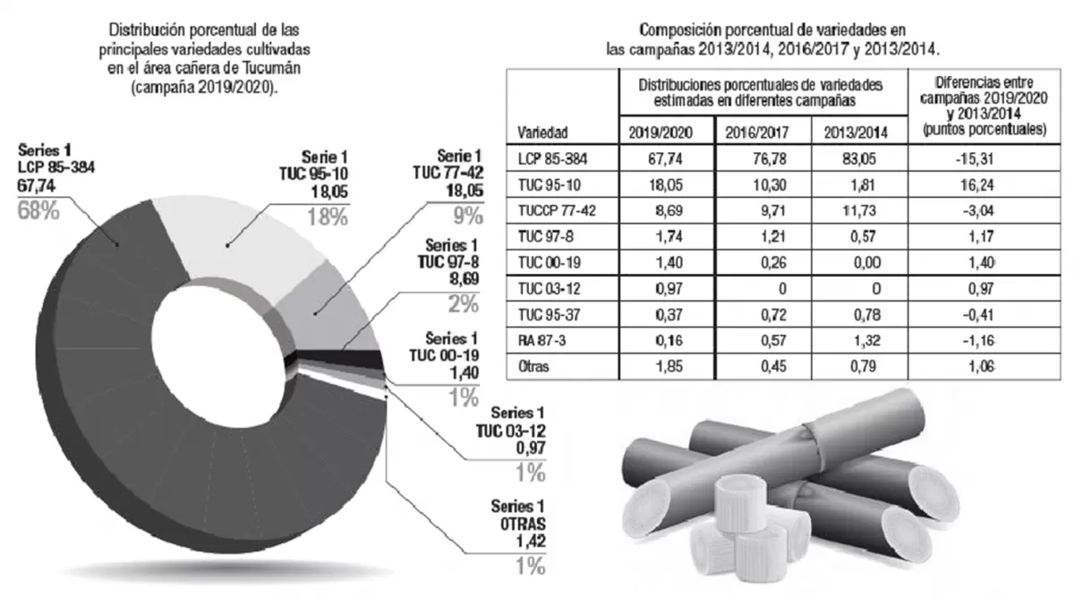 La Tabla 1 presenta los valores de las distribuciones porcentuales de las variedades comerciales relevadas por el Smgca para las campañas 2013/2014, 2016/2017 y 2019/2020). Además, muestra las diferencias entre las campañas 2013/2014 y 2019/2020 (última columna). Se observa que el decrecimiento en el área de cultivo de LCP 85-384, detectado entre las campañas comparadas, es de un 15,31%. Se resalta que el decrecimiento del área cultivada con esta variedad fue detectado, por primera vez, con la encuesta 2013/2014.