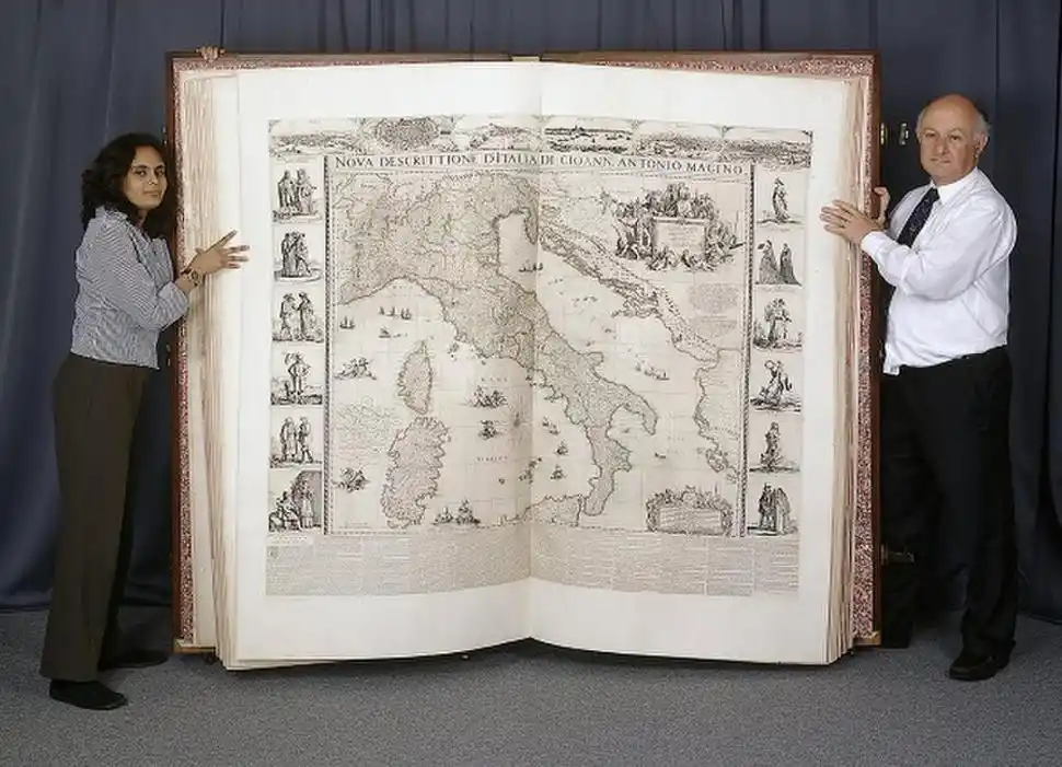 No sabemos si es el tercero en la lista pero sí merece ser nombrado, porque podemos decir que es el más antiguo, ya que tiene más de 350 años. Es el atlas más grande del mundo, un volumen de 1,78 x 2,1 metros que está en la British Library, y que data de 1660. Fue un regalo de unos comerciantes al rey Carlos II y pasó a formar parte de su gabinete de curiosidades. Incluye 37 mapas y es conocido como Atlas Klencke. Para manejarlo hacen falta seis trabajadores de la biblioteca.