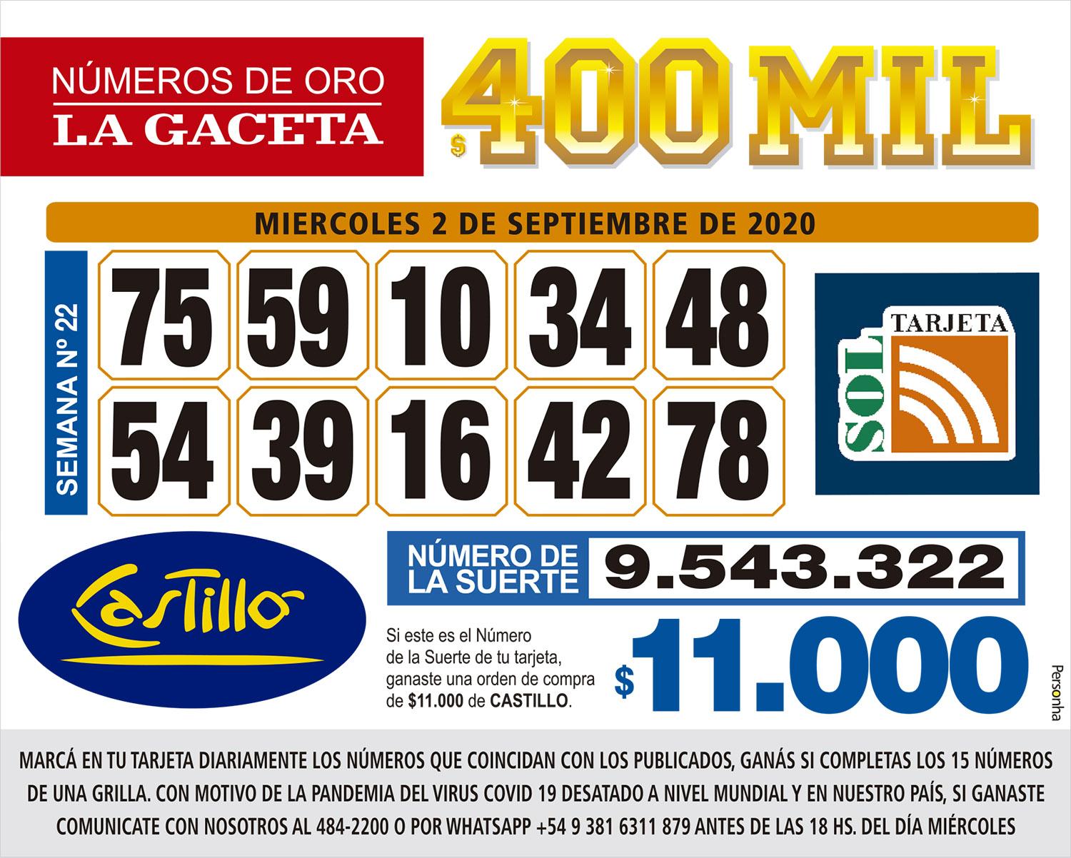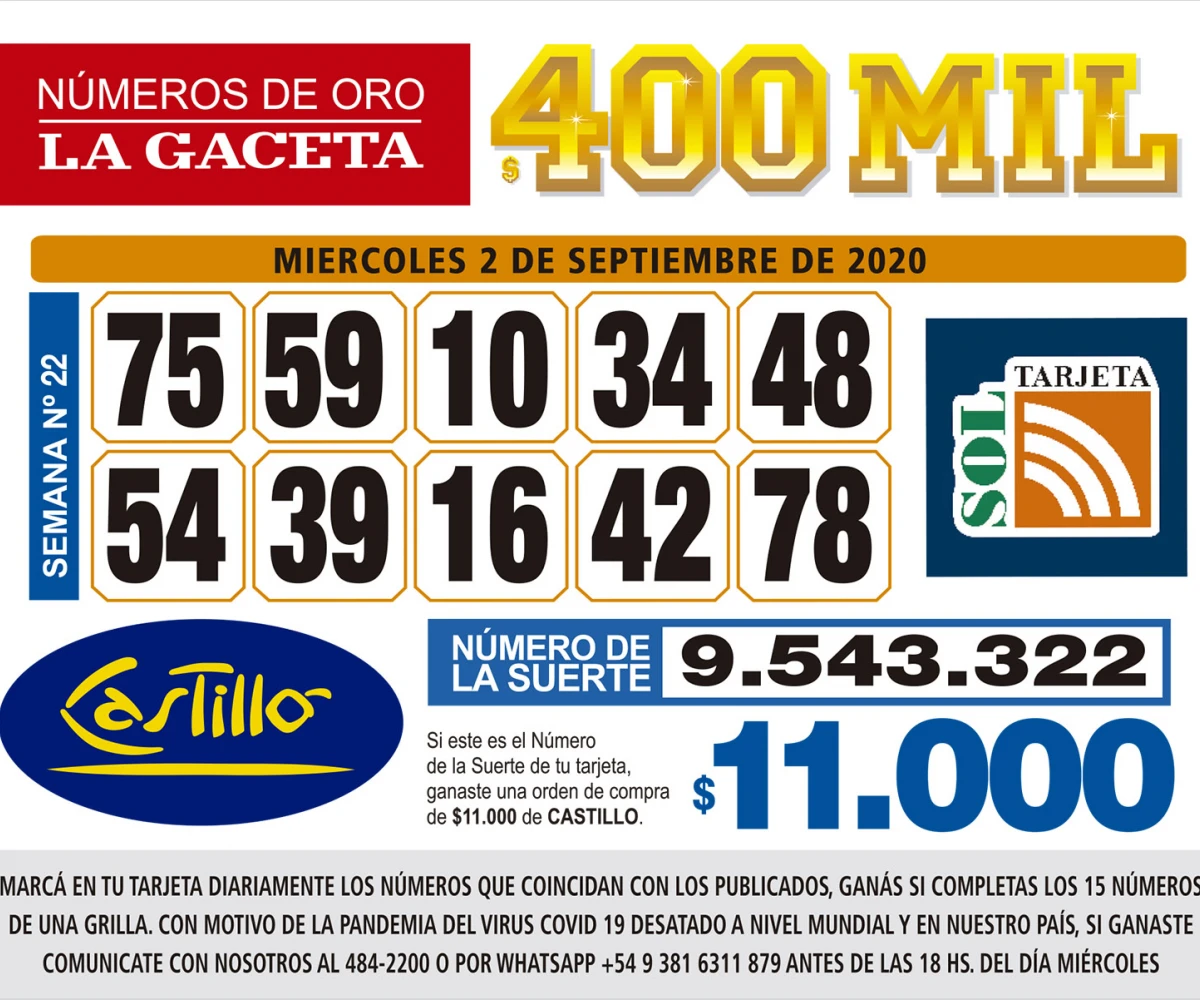 Números de Oro Los Números de Oro de LA GACETA Compartir Whatsapp Facebook X Copiar dirección URL 02 Septiembre 2020 Seguir en Esta nota es de acceso libre. Tamaño texto Comentarios Lo más popular Tucumán bajo alerta amarilla: pronostican tormentas fuertes, ráfagas y hasta granizo este sábado 4 de abril “No tenía cupo ni privilegios”, dijo Mariano Campero sobre el crédito que le otorgó el Banco Nación Milei denunció una campaña de Rusia contra el gobierno de Argentina Escándalo por los créditos hipotecarios del Banco Nación: Sandra Pettovello echó a su Jefe de Gabinete Peronismo en tensión: Kicillof, la lección de Manzur y la “hiperprovincialización” de Jaldo Al Cottolengo Don Orione ni siquiera le atienden el teléfono