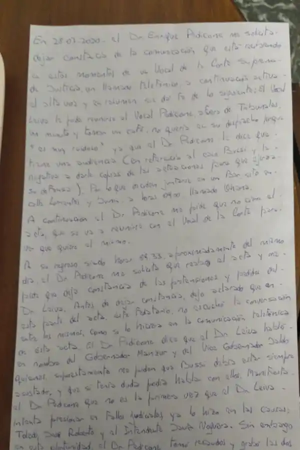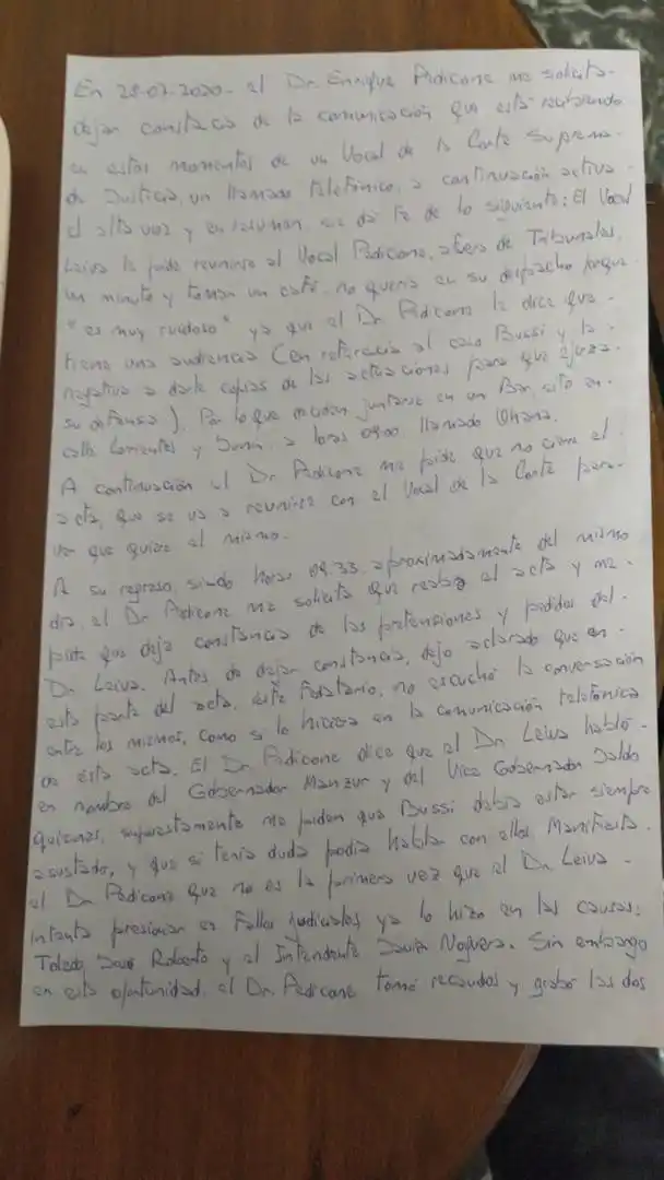 Pedicone: -Esta acta que hemos firmado juntos, bah, que la firmás vos, que escuchás la primera parte (de las grabaciones) y en la segunda ponés lo que yo te digo que pasó en ese bar… Esto puede traer un eventual gran escándalo. A vos te van a tratar de presionar, más si me contás sobre el decreto (de designación) para tu hijo que hizo Leiva…