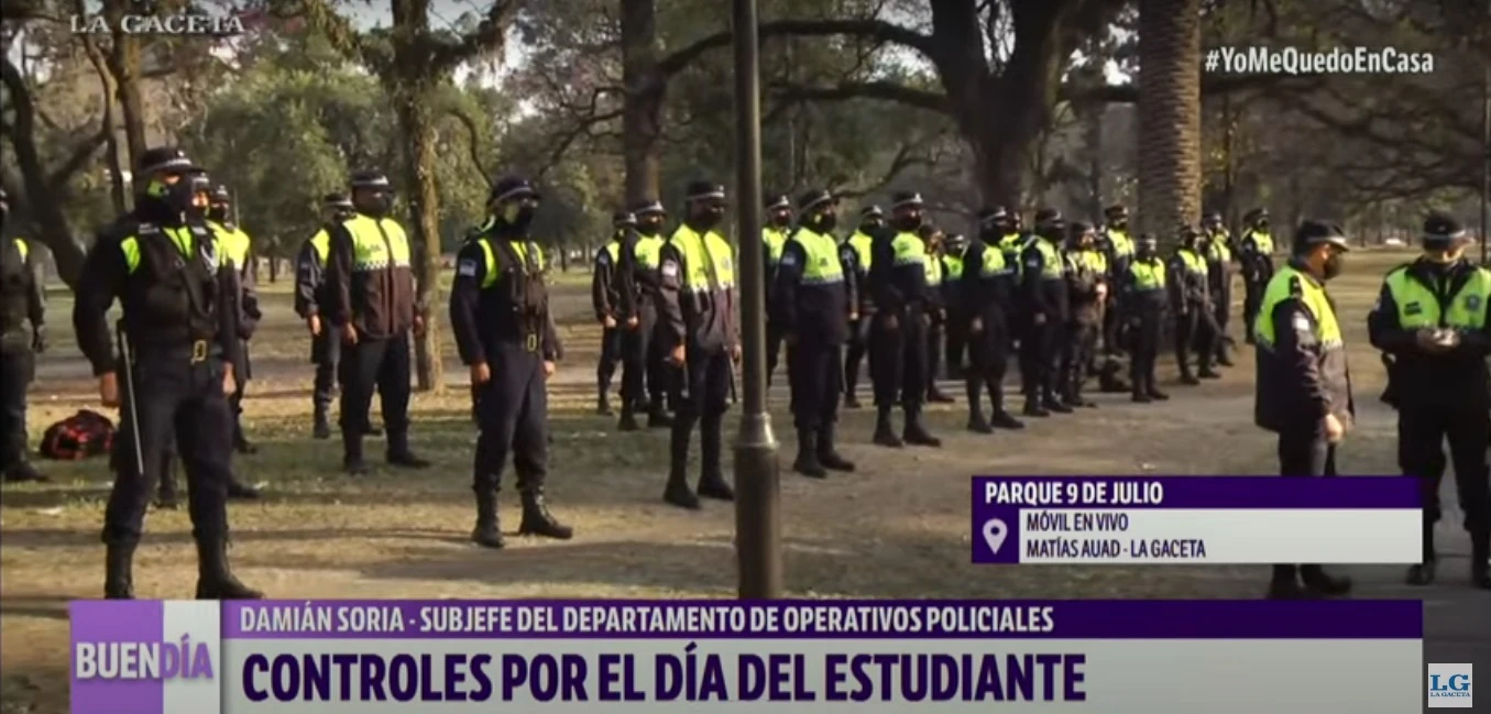 En el móvil de “Buen Día” se registró esta mañana el inicio de los operativos de la Policía, entre otros organismos, en los espacios públicos por el Día del Estudiante. “Estará permitido circular en bicicletas y hacer ejercicios de forma individual para evitar las aglomeraciones. Está habilitado el acceso a los bares del parque 9 de Julio, pero debe haber tres personas por mesas”, indicó Fabián Soria, subjefe de Departamento Operaciones de la Policía.