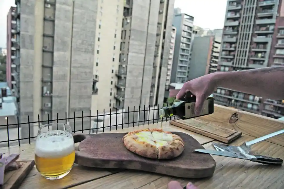 “Vivo en un departamento chico, pero con un lindo balcón y muy buena vista, orientado al este. Vi la barra en lo de un amigo y me hice hacer una, a medida. La colocaron el viernes y desde ese día no he vuelto a usar la mesa. Acá hago todo, sobre todo ahora que cierran temprano los bares...”, cuenta Patricio Robles, mientras sirve unas pizzas cocinadas en una parrilla eléctrica, también para el balcón.