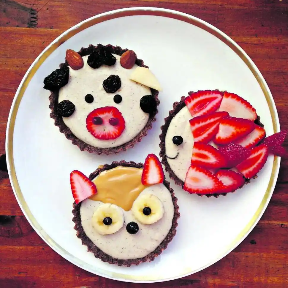 8. Pensar en el animal que queramos y decorar con frambuesas, frutillas, pasas de uva, ciruelas, almendras y chips de chocolate.