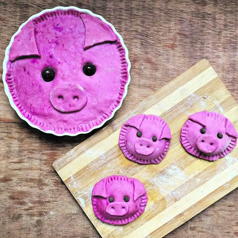 11. Elaborar con la porción restante la nariz y las orejas del cerdo. Una vez listas llevar la tarta al horno por unos 15 minutos.
