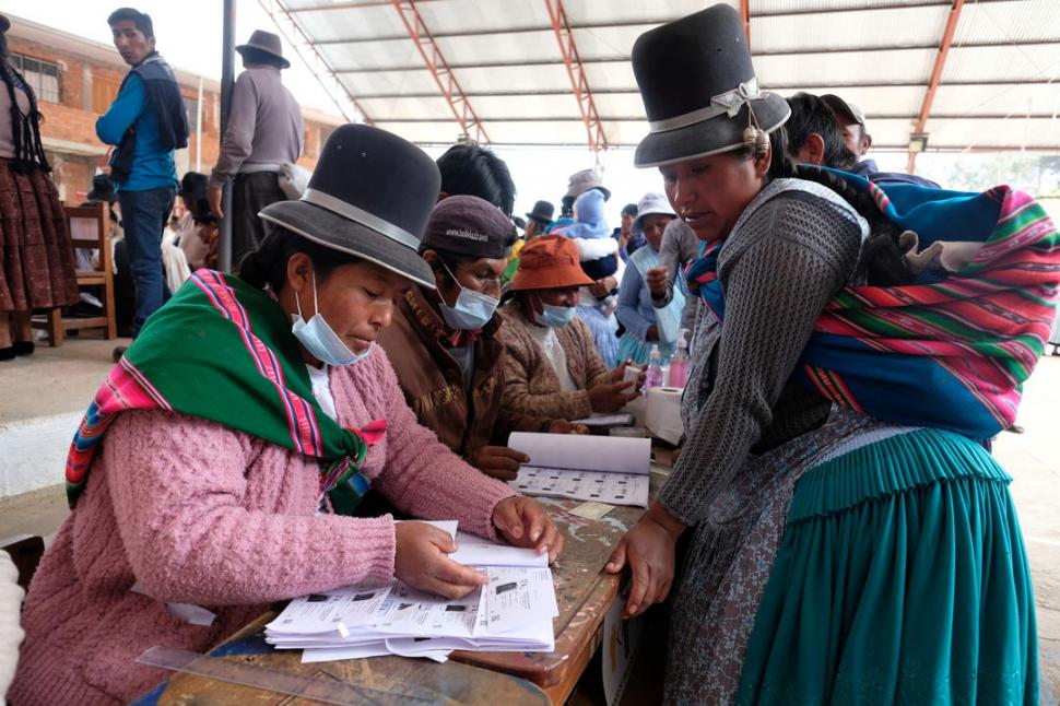 LARGAS FILAS. Mujeres con sus trajes tradicionales esperan para votar en una mesa de Cohoni, al sudeste de La Paz. REUTERS