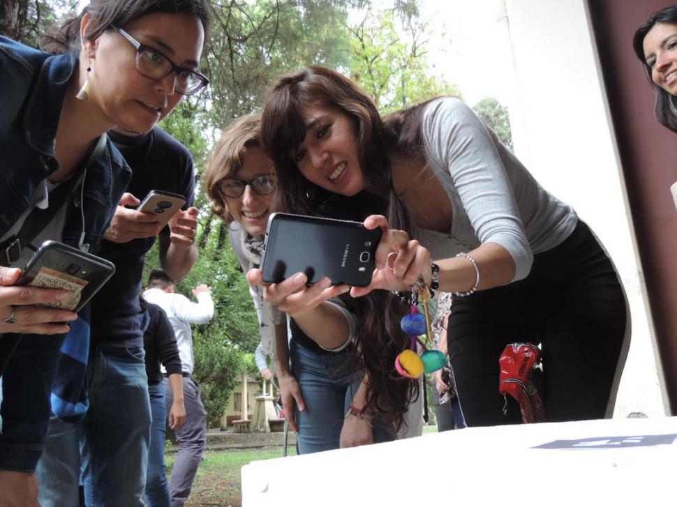 REALIDAD VIRTUAL. Visitantes de la primera muestra escanean con el celular códigos QR para “crear” las urnas.
