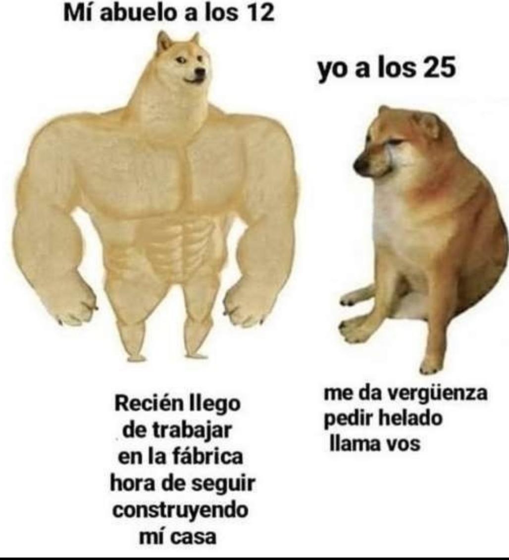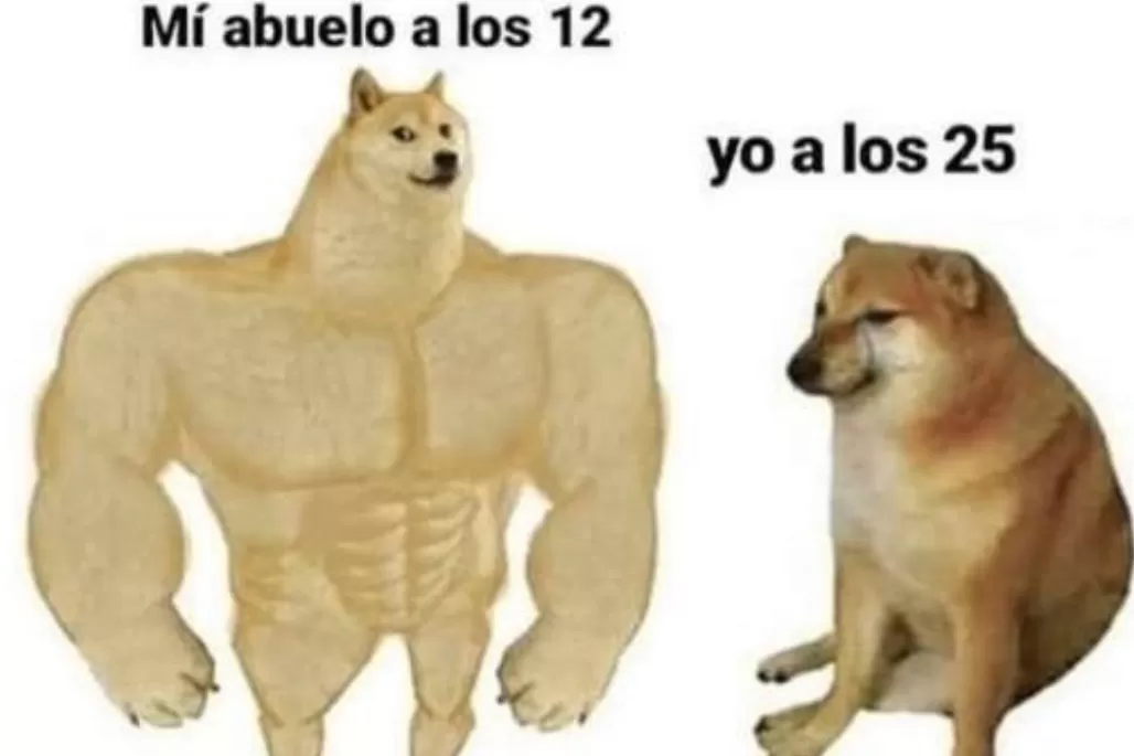 Es el meme más difundido de la cuarentena. Hay dos perros, Doge y Cheems, uno al lado del otro. Uno es grandote y fortachón. El otro, sentado en el suelo, es más pequeño y luce débil y avergonzado. La imagen se repite con distintos textos. Uno de ellos, por ejemplo, dice: “Mi abuelo a los 12 (bajo el animal musculoso): recién llego de trabajar, hora de seguir construyendo mi casa”. Donde está el can flácido el mensaje es: “yo a los 25: me da vergüenza pedir helado, llamá vos”.