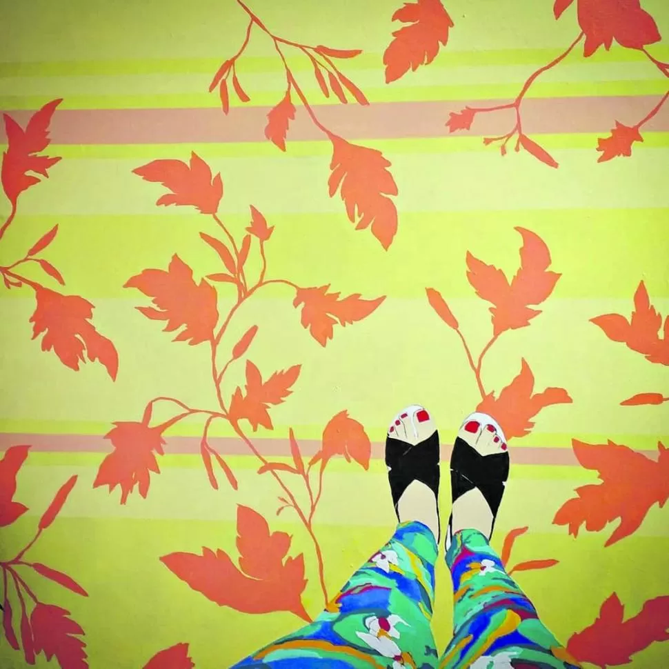 -En esta serie de pinturas utilizo parto de proyectar las piernas. Esta serie surgió después de estar obsesionada con otra parte del cuerpo (el torso y cuello); me di cuenta que todo el tiempo me sacaba esas selfies de piernas como mucha gente más, en diferentes lugares, recuerdos de viajes, de días, de fiestas y mucho más. Elegí pintarlas, pero tienen la particularidad estas obras que ninguna de estas piernas pisa suelo firme; serían como la creación de espacios surrealistas, parada en flores, en naranjas cortadas, en bananas enteras, en un cielo con nubes algodonosas, o en vegetaciones vistas de frente.