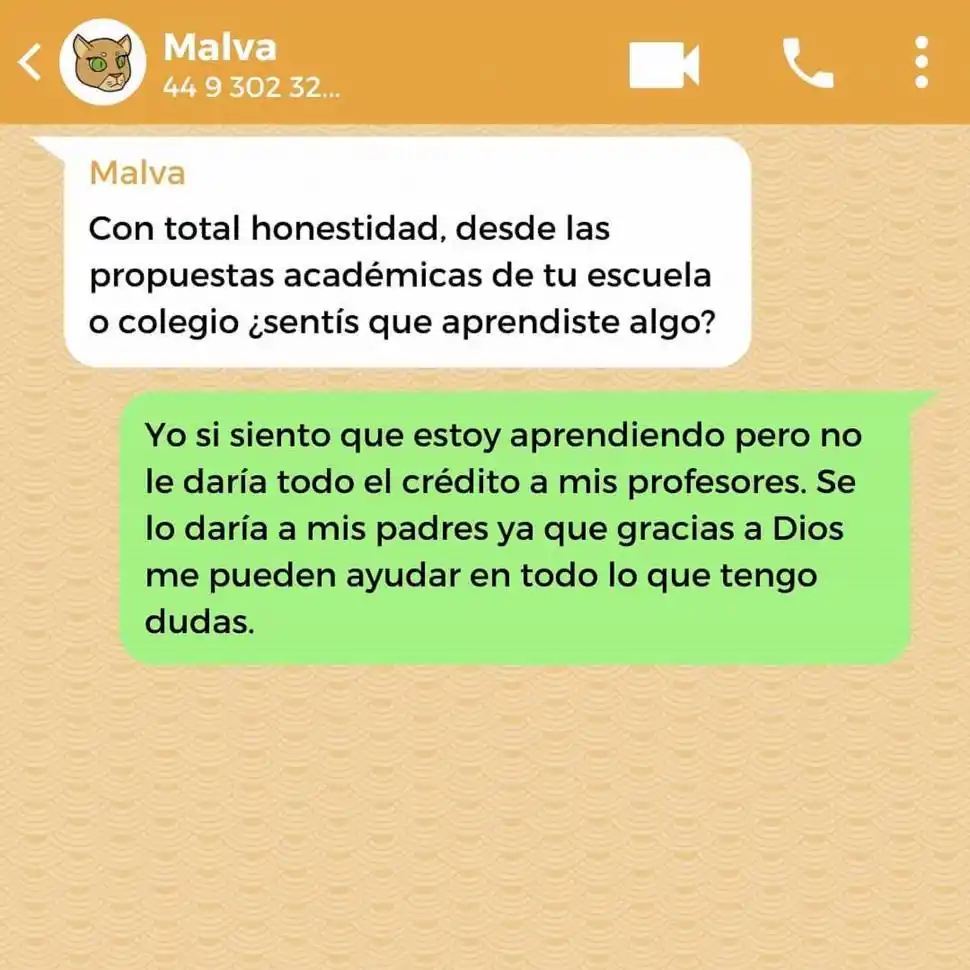 - “Creo que mejoré mi participación en clases porque, como no me ve el resto de mis compañeros cuando hablo, al no prender la cámara, me siento más libre de decir lo que pienso sin que me estén mirando ni yo ver la reacción de los demás con sus gestos”.
