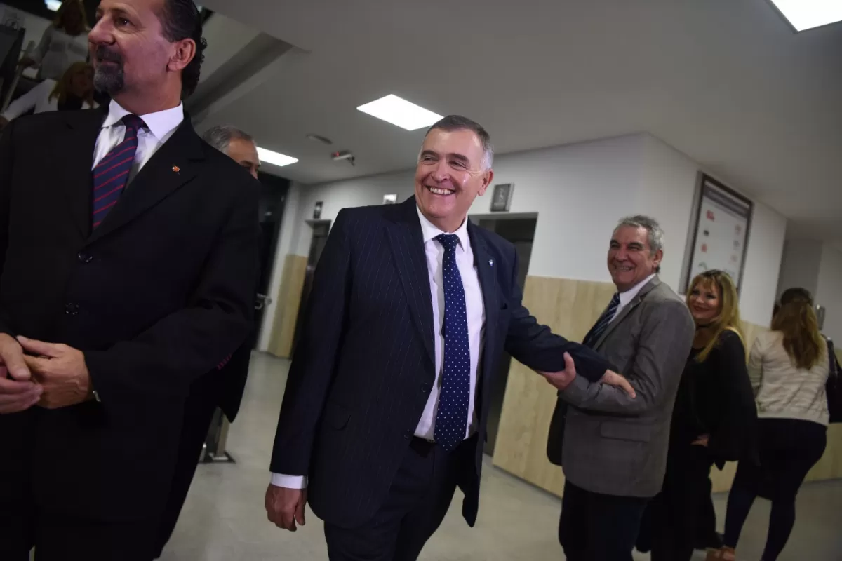 EN LA INAUGURACIÓN DEL NUEVO EDIFICIO JUDICIAL. El vicegobernador Jaldo toma el brazo del juez Pisa ante el concejal Juri, en un acto de 2018. FOTO DIEGO ARÁOZ