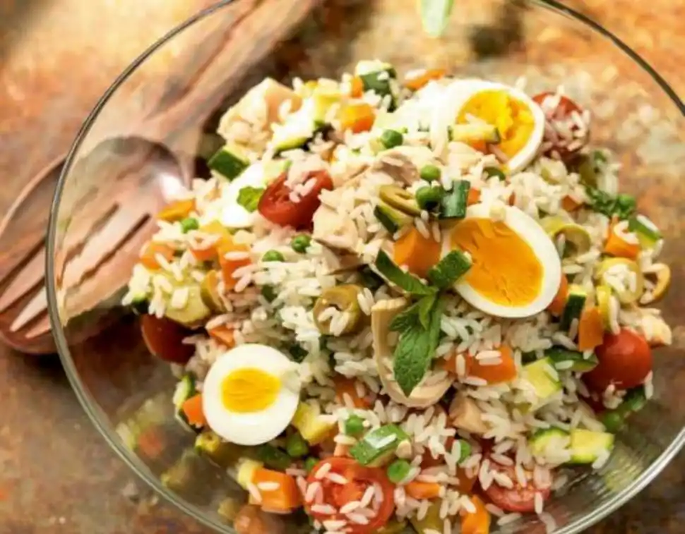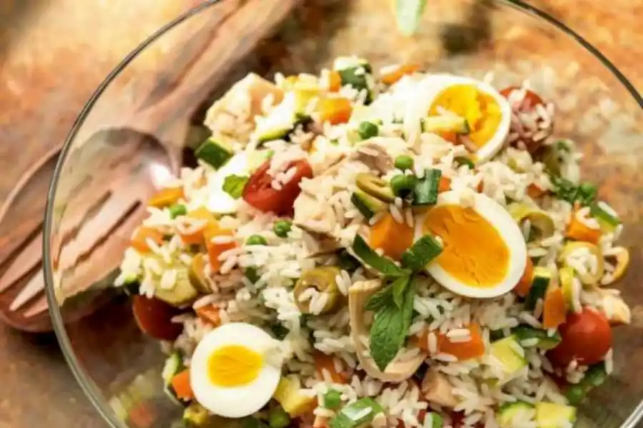 Con arroz: necesitás para cada porción un pocillo de arroz cocido y frío; 1 huevo duro; dos cucharadas de arvejas y dos de choco en grano; unas tiras de pimientos asados; 1/2 tomate cortado en trocitos, unas aceitunas y dos cucharadas de pollo cocido, frío y en tiritas. Sazonar con 50% de mayonesa light y 50% de queso blanco