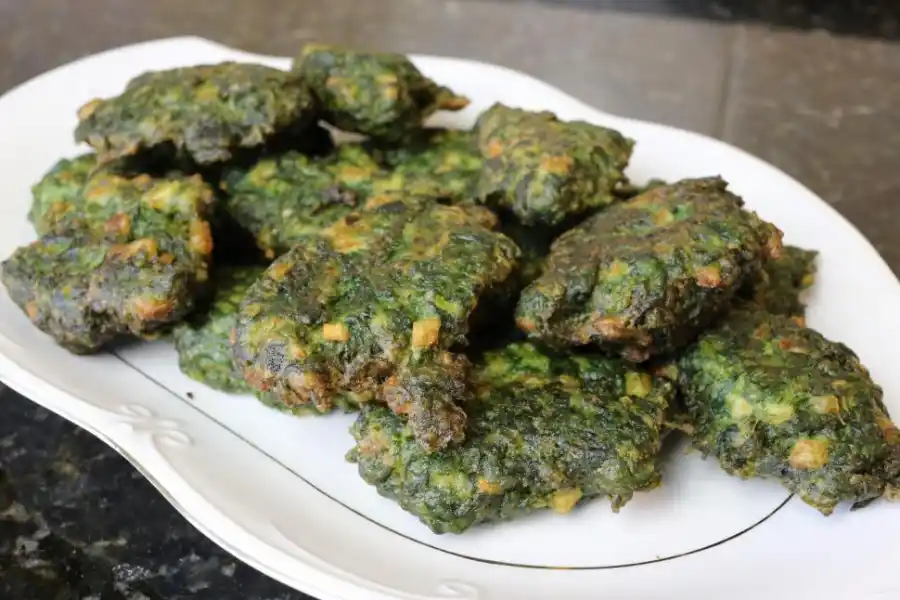 De espinacas: lavar muy bien y picar un atado mediano de espinacas; pelar y picar un diente de ajo grande y rallar 80 g de queso parmesano. En un recipiente profundo batir 2 huevos y luego agregar el resto de los ingredientes; añadir sal y pimienta y mezclar muy bien. Poner la mezcla en una fuente apta para horno con rocío vegetal oleoso y cocinar a 180 ° durante unos 15 minutos. Sacar del horno, esperar que se enfríe unos minutos, cortar en cuadrados que se puedan tomar con la mano, empaquetar y poner en la conservadora para que se mantenga tibio.