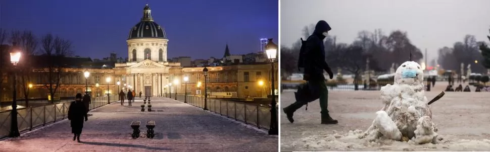 El emblemático Puente de las Artes, en el centro de París, luce poco transitado, de noche y de día, por las restricciones de la Pandemia. Antiguo destino de enamorados que colocaban candados con promesas y arrojaban las llaves al río Sena, ahora tiene un muñeco de nieve por todo emblema. Eso sí, bien provisto de un barbijo.