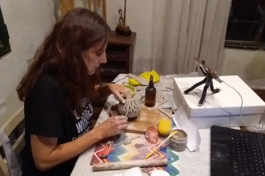 Díaz es licenciada en Artes Visuales y Técnica Ceramista, y hace años enseña esta cerámica a adultos. En este momento, por supuesto, lo hace de modo virtual. “Nos conectamos todos juntos y vamos realizando las piezas paso a paso respetando los tiempos de cada uno. Previamente los alumnos preparan los materiales que utilizaremos en cada clase y una vez terminadas las piezas las traen al taller para que las cocine en el horno eléctrico”, señala la ceramista.