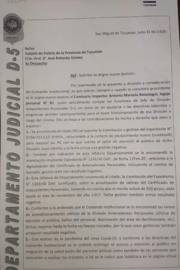 - Por la pandemia, Sbrocco le ordenó tomar medidas para reducir la presencia de público y del personal policial en la oficina, requerimiento que tampoco acató.