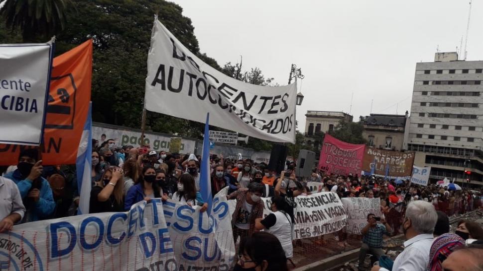 Distintas agrupaciones que conforman la Mesa Coordinadora de la Unidad Docente realizaron ayer una nueva protesta frente a la plaza Independencia. El objetivo era expresar su disconformidad con la representatividad del Frente Gremial Docente (ATEP, APEM y AMET), solicitar una recomposición salarial del 52% y mejora de la infraestructura escolar.