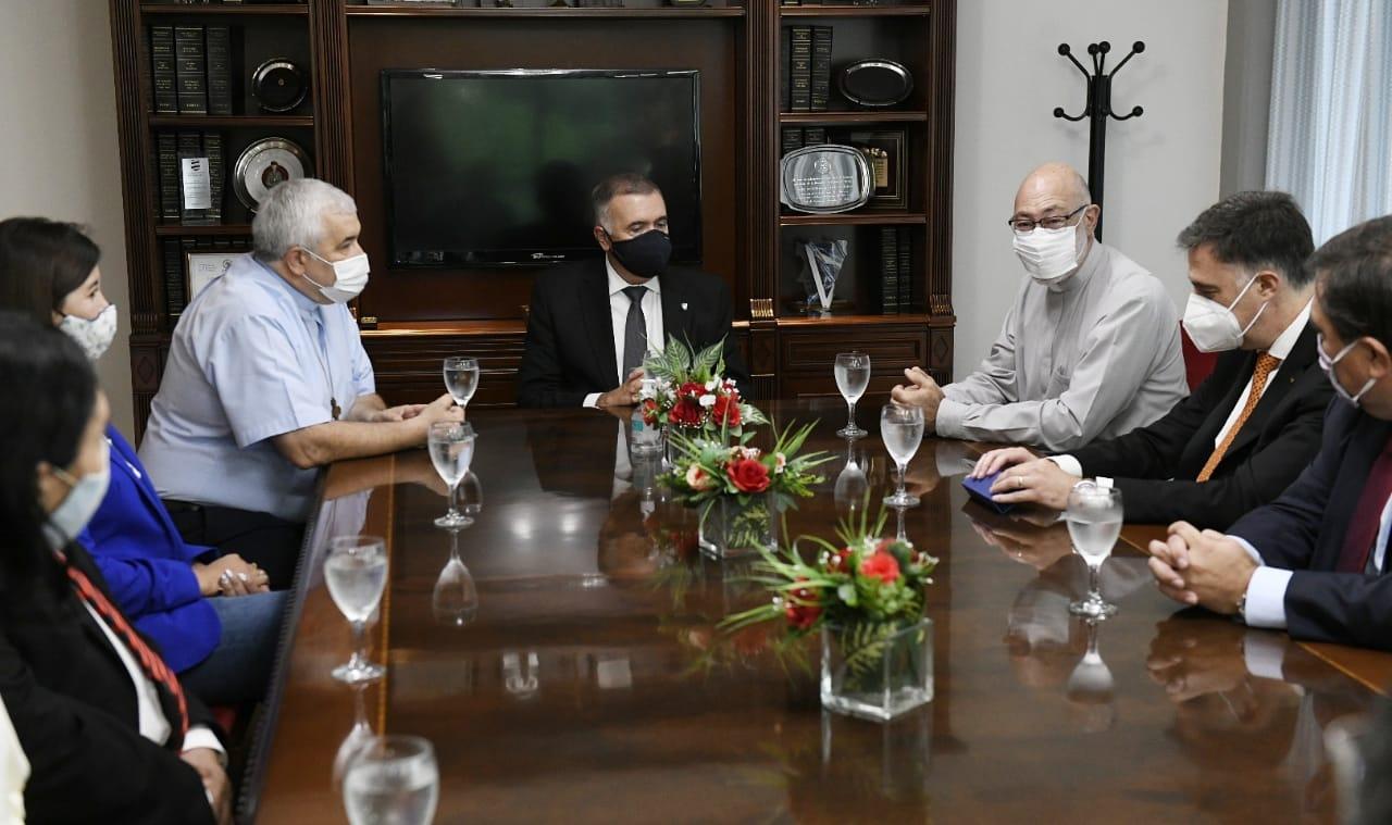 El vicegobernador Osvaldo Jaldo, en ejercicio del Poder Ejecutivo por la ausencia del gobernador Juan Manzur, recibió esta mañana en la Legislatura al Arzobispo de Tucumán, monseñor Carlos Sánchez, y al nuevo obispo auxiliar de la Arquidiócesis de Tucumán, monseñor Roberto José Ferrari.