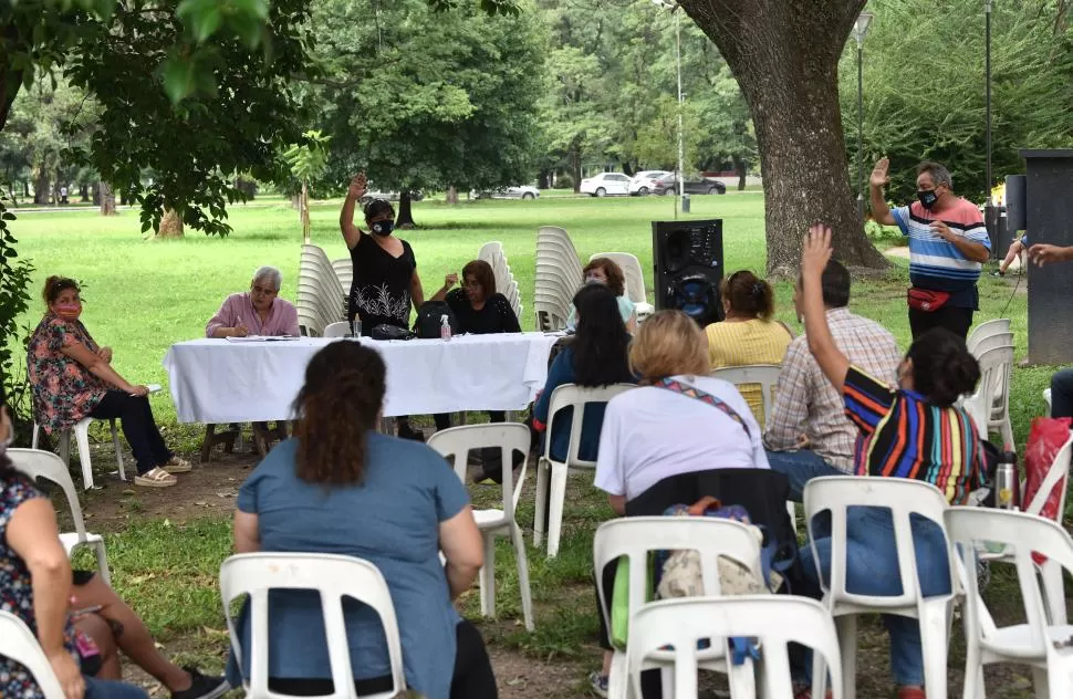 El parque 9 de Julio albergó ayer la asamblea de las agrupaciones opositoras al FGD. Allí ratificaron las medidas que tomarán en rechazo al acuerdo salarial firmado con el Gobierno. Acordaron que el lunes habrá paro general y el martes a las 10 una sentada frente a la Casa de Gobierno.