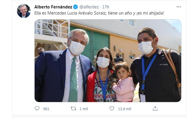 El presidente Alberto Fernández presentó este jueves a su primera ahijada presidencial. El jefe de Estado conoció a la niña durante su visita a Bariloche, en donde encabezó la firma de acuerdos con INVAP para la provisión de radares de nueva generación RPA 200 para el Sistema Nacional de Vigilancia y Control Aeroespacial. La nena se llama Mercedes Lucía Arévalo Soraiz y tiene un año.