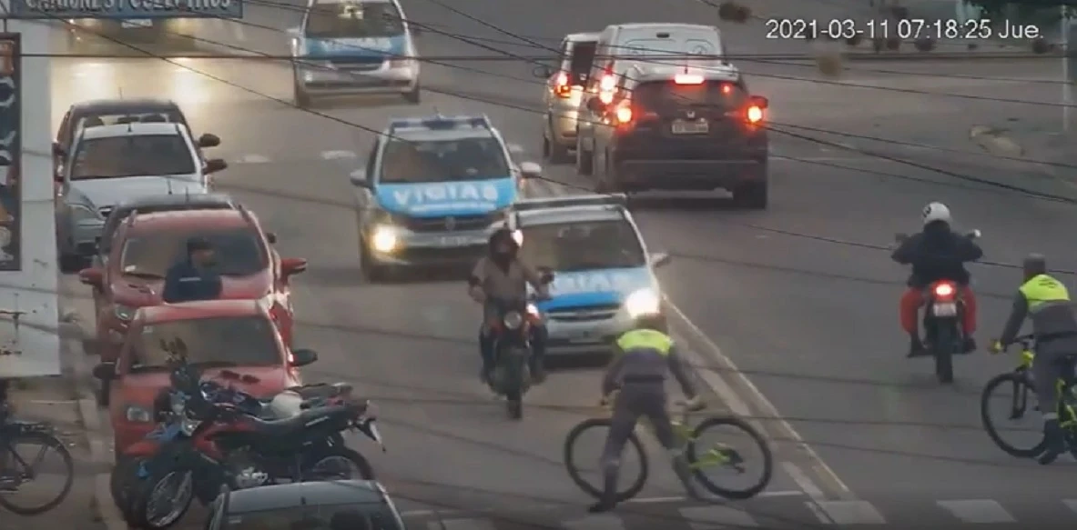 Un "bici-vigía" protagonizó una valiente maniobra esta mañana en Banda del Río Salí, al colocarse frente a un hombre que escapaba en moto a alta velocidad de dos patrulleros.