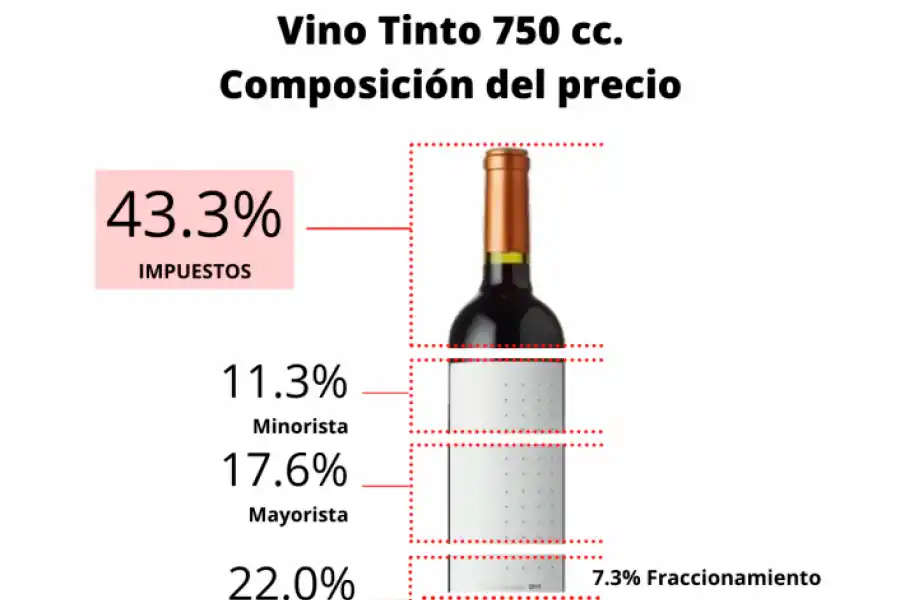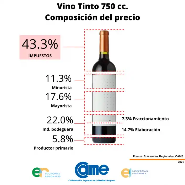 Según el trabajo efectuado por la Came, durante la segunda semana de febrero 2021 el precio promedio en góndola de una botella de vino tinto gama media-baja de 750 cc en Capital Federal fue de $ 215,5. De ese valor, el productor de uva explica el 5,8% ($ 12,4); la industria bodeguera el 22% ($ 47,4) -14,7% elaboración y 7,3% fraccionamiento-; el mayorista el 17,6% ($ 37,9), el minorista el 11,3% ($ 24,5), y los impuestos el 43,3% ($ 93,4).
