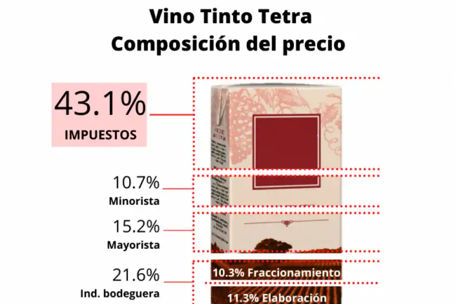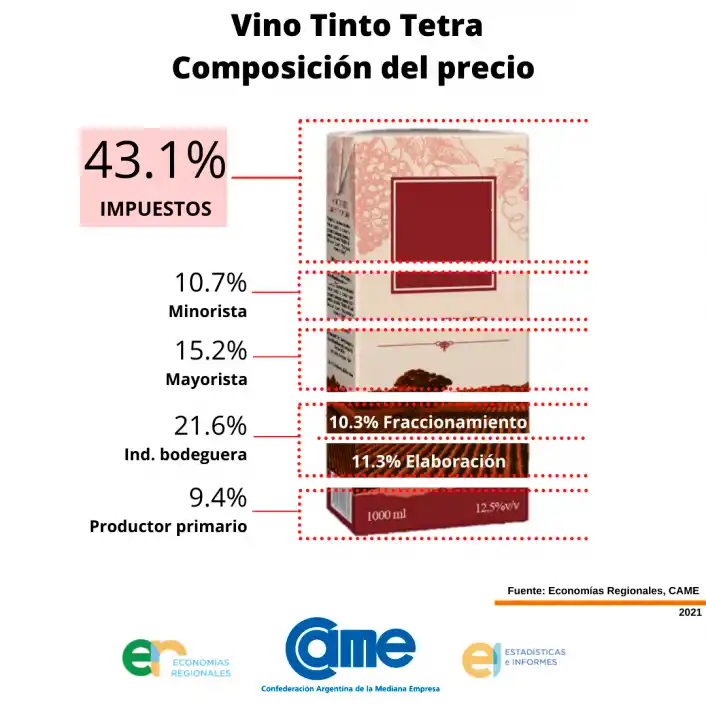 Al desagregar los impuestos desde la cosecha de la uva hasta la venta del tetra en góndola, el trabajo de la Came destaca que el 69,9% son impuestos de origen nacional y el 30,1% impuestos provinciales o tasas municipales. Con respecto a los gravámens específicos de la cadena de valor, el 41,9% corresponde al IVA, el 24,5% al Impuesto a las Ganancias, el 16% a Ingresos Brutos, el 3,5% a impuestos sobre la mano de obra, y el 14,1% a otros impuestos provinciales o tasas municipales.