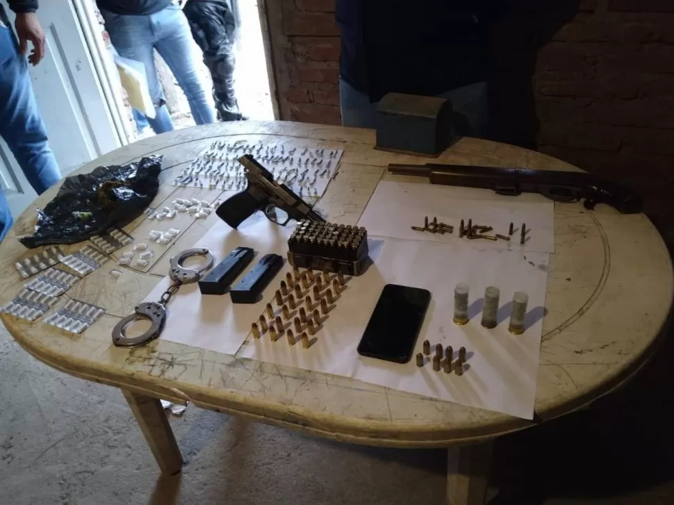 Aprehendieron a dos hombres a quienes se les secuestró armas de fuego, municiones, uniformes policiales, cinco motocicletas, estéreos, artefactos de iluminación, 100 “alitas” de cocaína, 400g de marihuana y pastillas ansiolíticas. Todo eso fue resultado de una serie de allanamientos ordenados por la Justicia en el barrio 11 de Enero, en la localidad de Cebil Redondo.