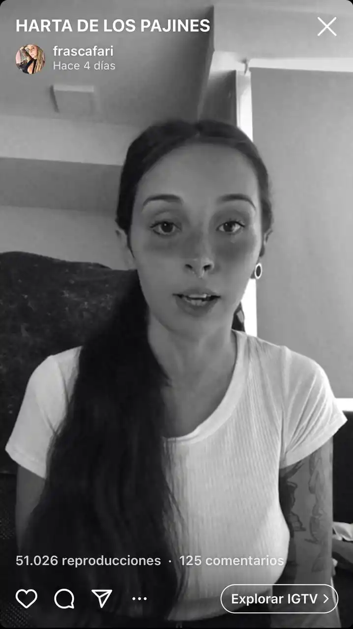 El video de Camila tuvo cientos de miles de reproducciones durante esta semana. A ella se la ve entera, más enojada y preocupada que lastimada por lo que vio en el grupo en el que logró infiltrarse. Las imágenes que encontró de ella no eran de contenido sexual pero, según describió, los hombres que las compartía se encargaban de sexualizarlas. “Harta de los pajines”, era el título del video, en referencia a estos usuarios (foto).